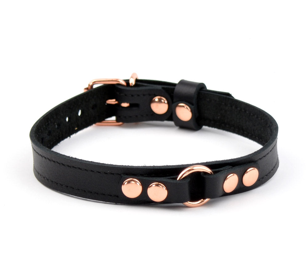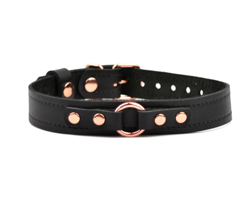 Black Leather Aurum Collar with Small Rose Gold Ring Detail