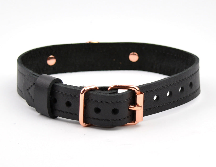 This gorgeous Aurum Series choker collar is handcrafted from luxurious high quality black leather, stitched with matching thread and appointed with a rose gold ring secured with leather straps to create a truly unique item.