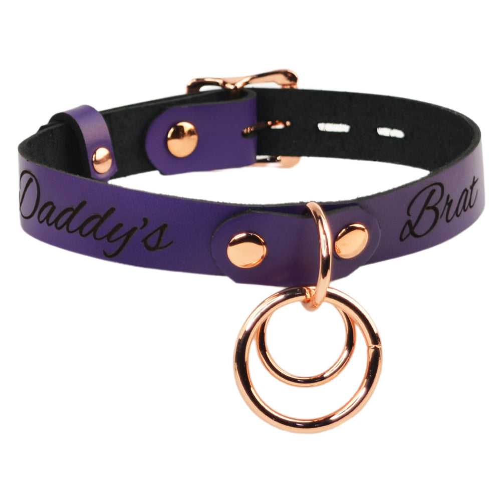 Custom Engraved Leather Dual Ring Collar Purple with Gold Rose Gold or Silver Hardware