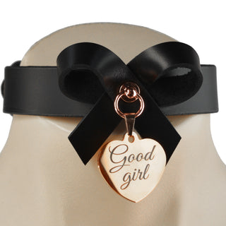 Black Leather Collar With Bow and Custom Engraved Rose Gold Love Heart Pendant