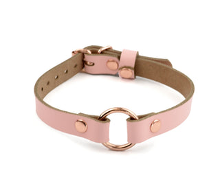 Blush Pink Leather Custom Rose Gold Lettering Bondage O-Ring Collar & Leash - 'Chastity Trained'
