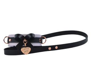 Premium Lavender BDSM Leather Bow Collar With Custom Engraved Rose Gold Pendant and Leash