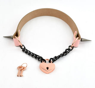 Blush Pink Leather & Black Chain Aurum Collar with Spikes & Love Heart Padlock