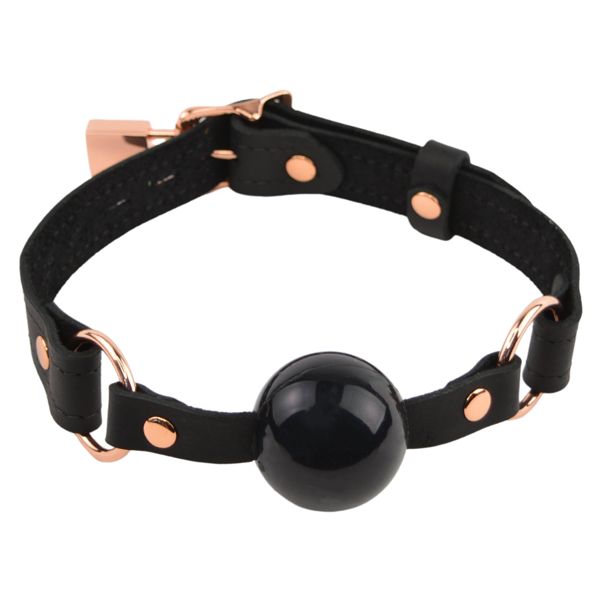 Black Leather & Rose Gold Premium Single Strap Ball Gag - Black Ball