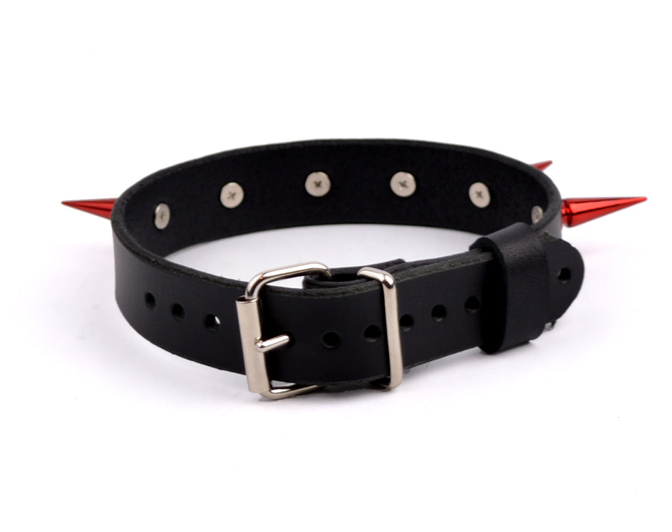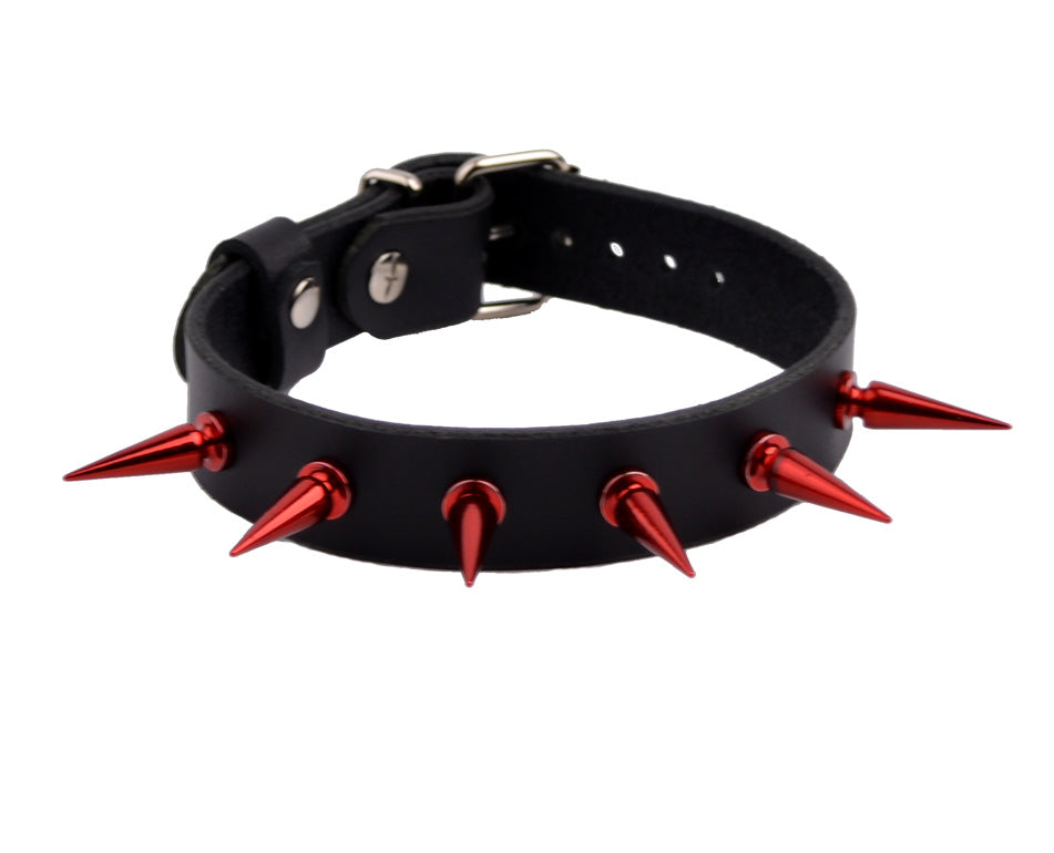 This collar certainly sends a statement! Made from the highest quality soft but heavy duty leather, this collar has bevelled edges for your comfort, and is appointed with eye-catching metallic red spikes.