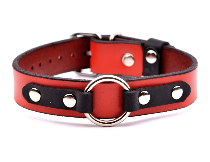 This heavy duty collar is handcrafted from striking thick red leather. The edges are bevelled for your comfort and coloured black to add a eye-catching contrast, matched by the black leather straps securing the welded O-Ring. This is a very unique piece and looks fantastic on!