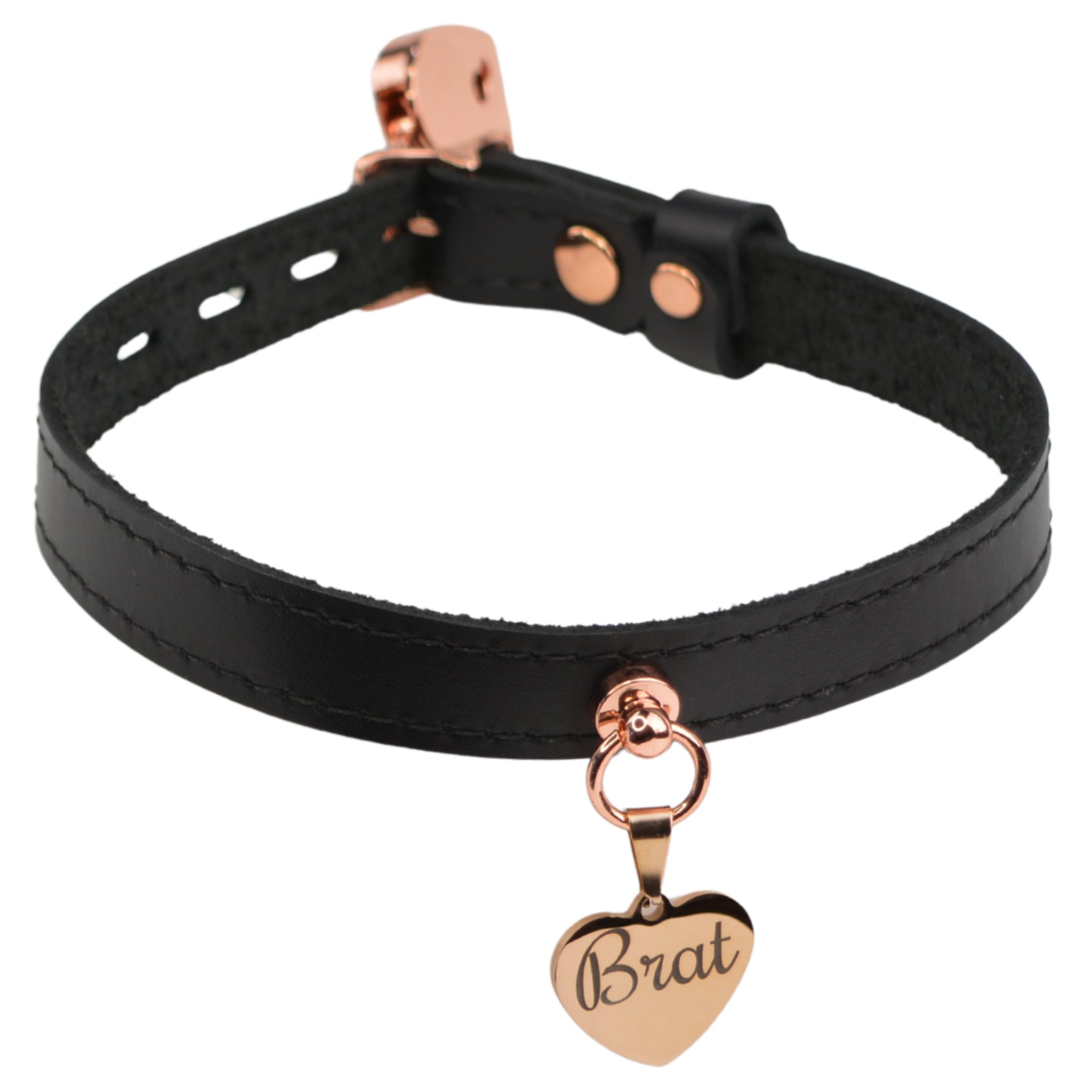 Black Leather Amare Day Collar with Custom Engraved Rose Gold Love Heart Pendant – 'Brat'