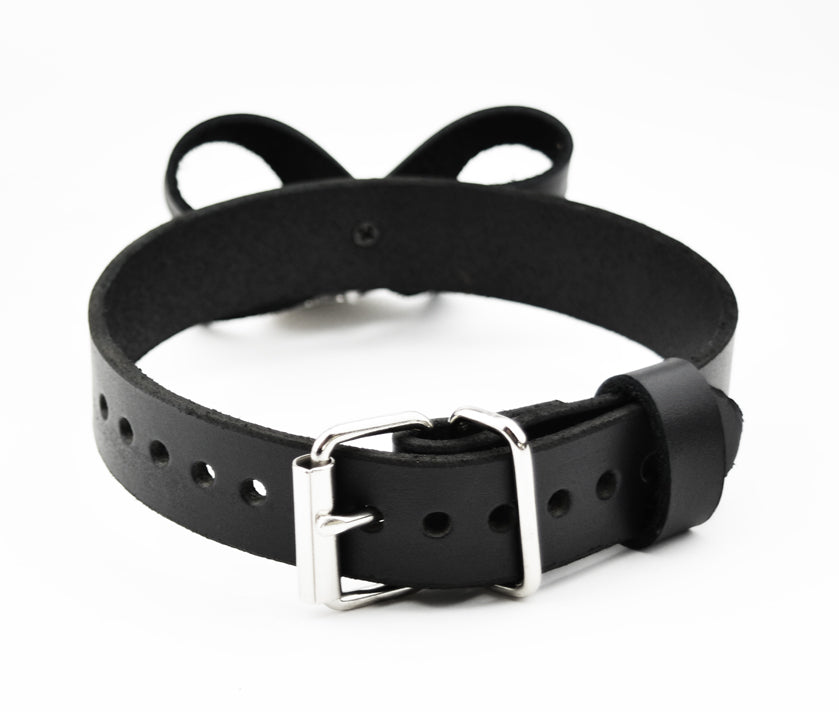 Black Leather Collar With Bow and Custom Engraved Silver Love Heart Pendant