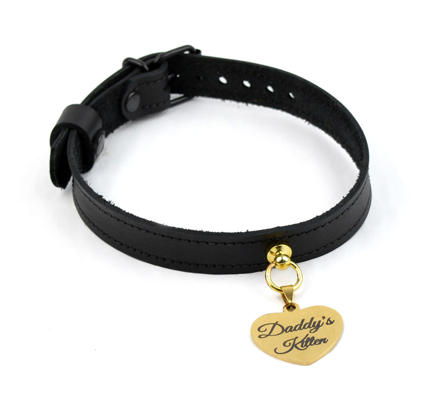 Black Leather Collar with Gold Custom Engraved Love Heart Pendant