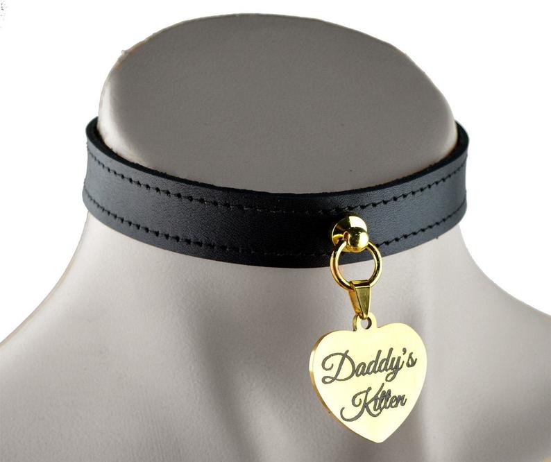 This cute collar is handcrafted from thick luxurious black leather, artfully stitched with matching thread and appointed with a gold heart pendant. The pendant can be engraved on one or both sides with your choice of words (please see photos for font options). The collar is easily flipped to display either side's engraving.
