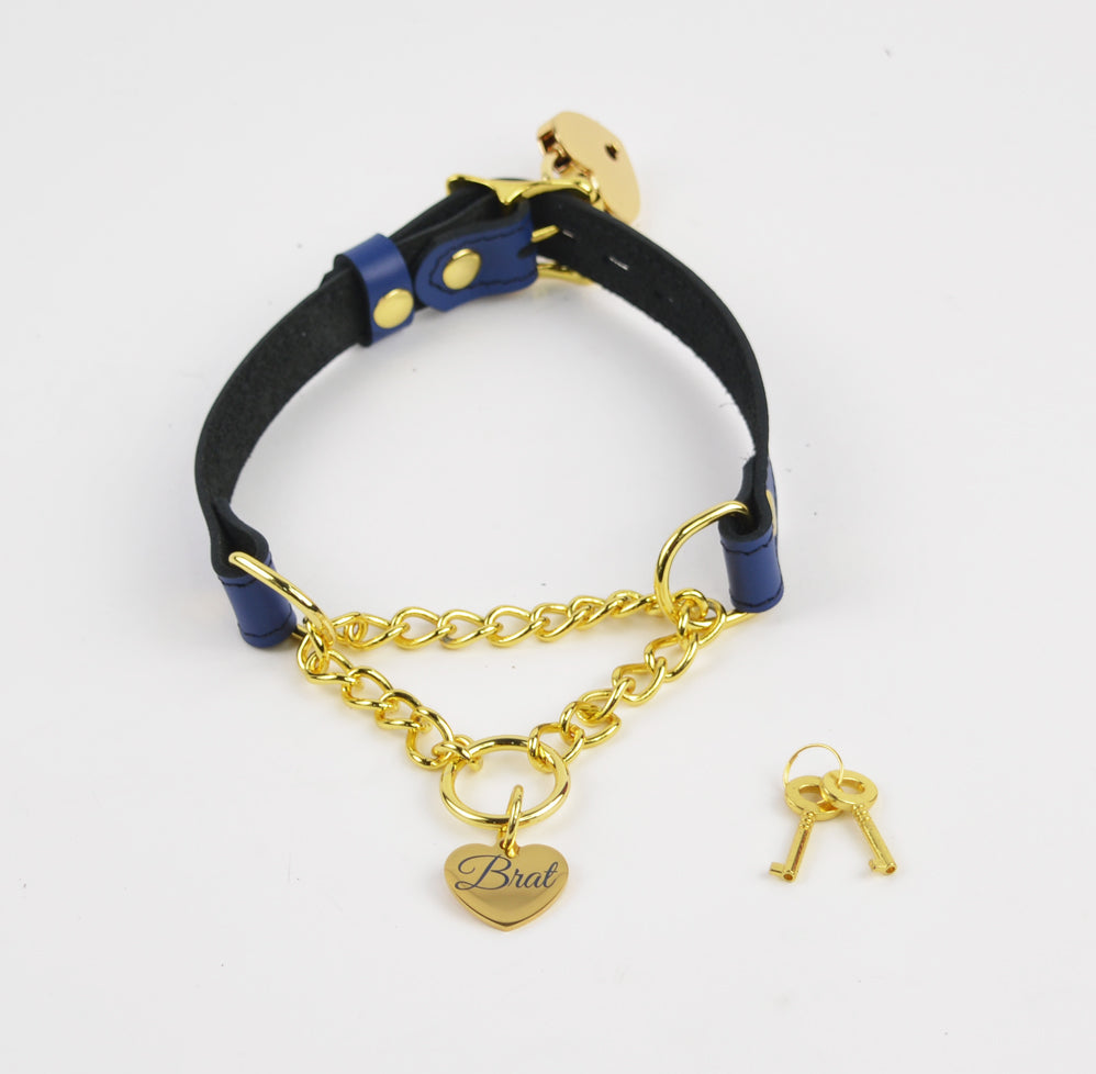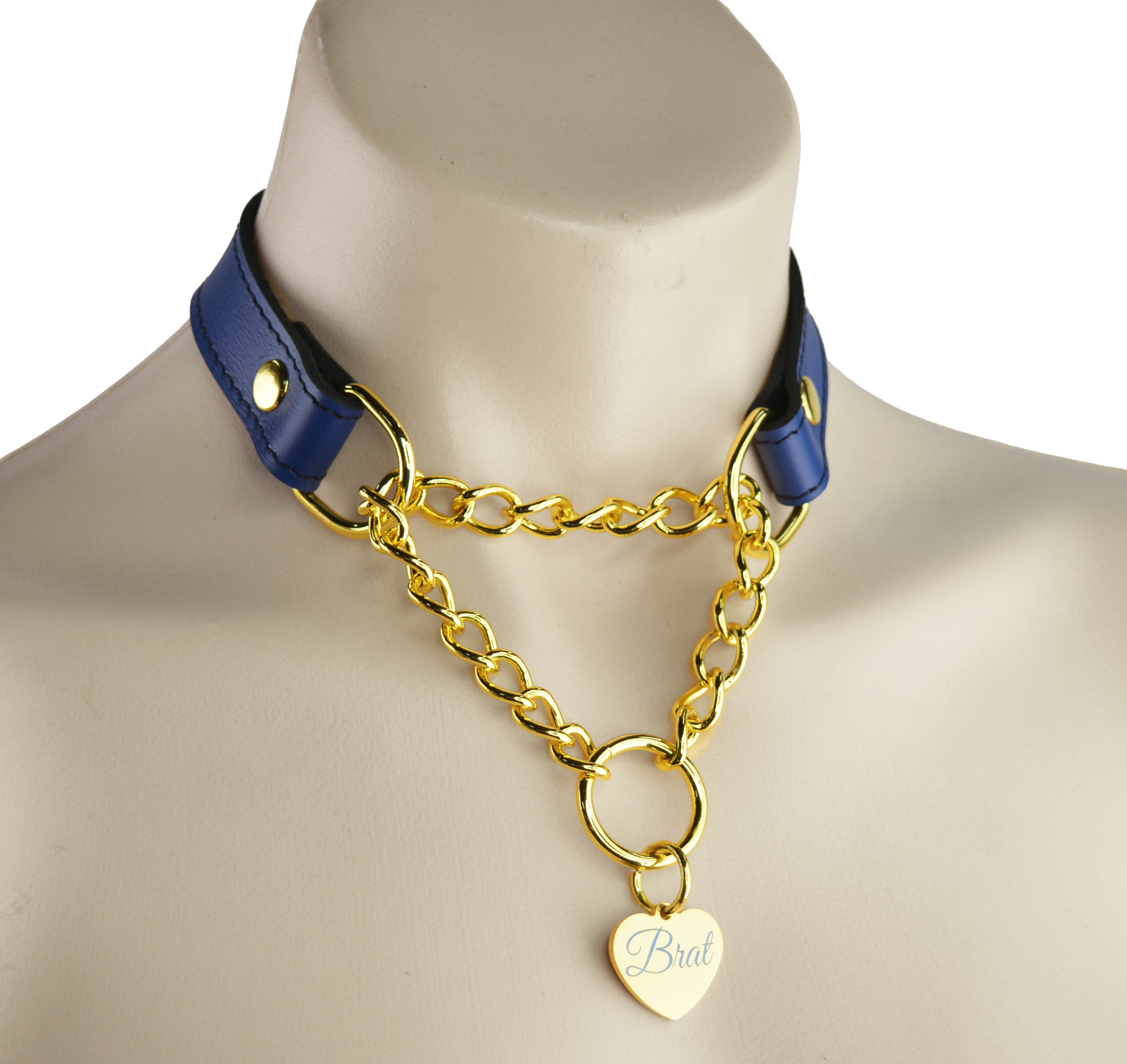 Turn heads with this unique martingale collar with custom engraved gold love heart tag! Handcrafted from stunning full grain deep blue leather, stitched with matching thread and also featuring a gold chain and O-Ring this collar is pure luxury.