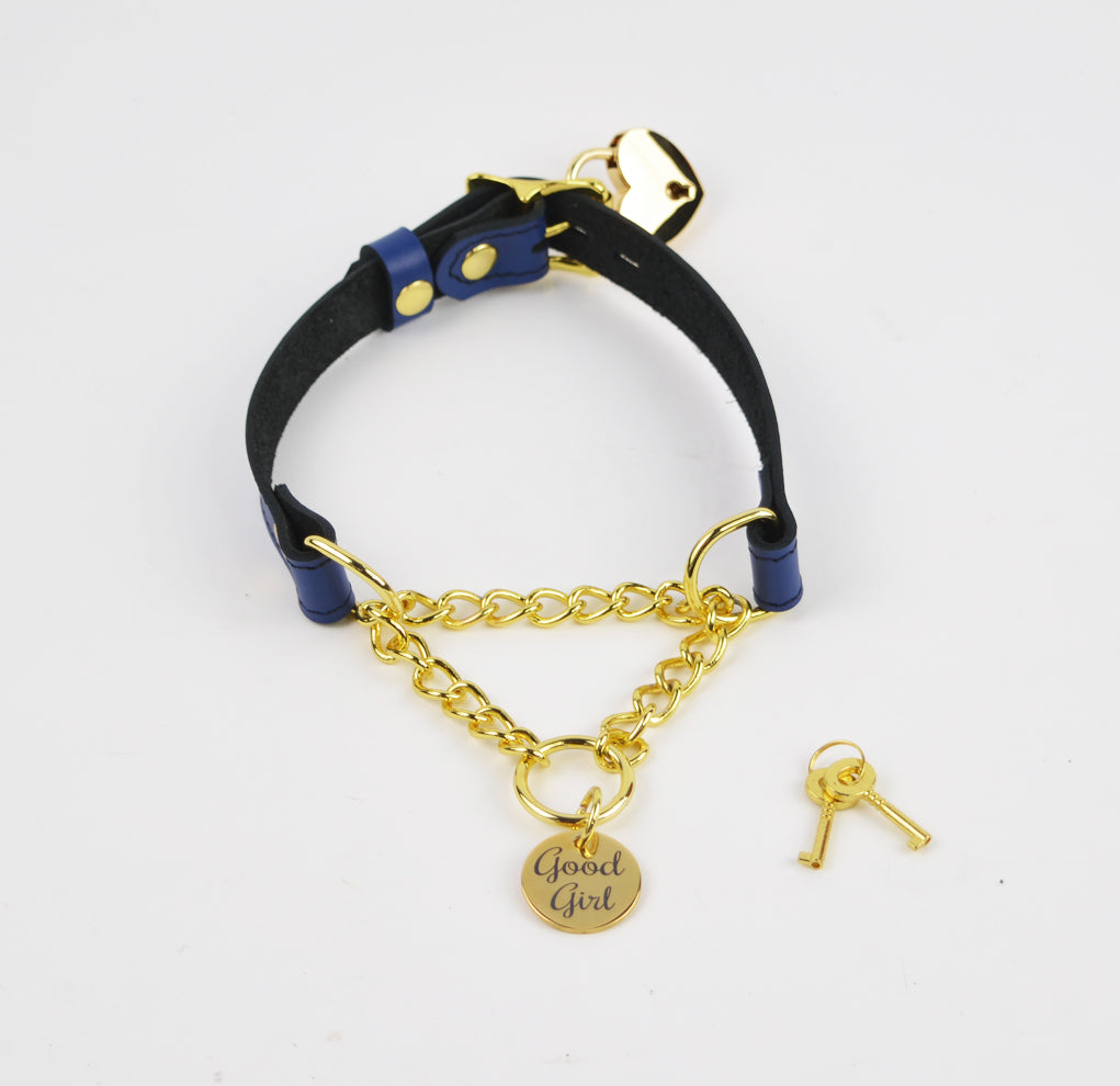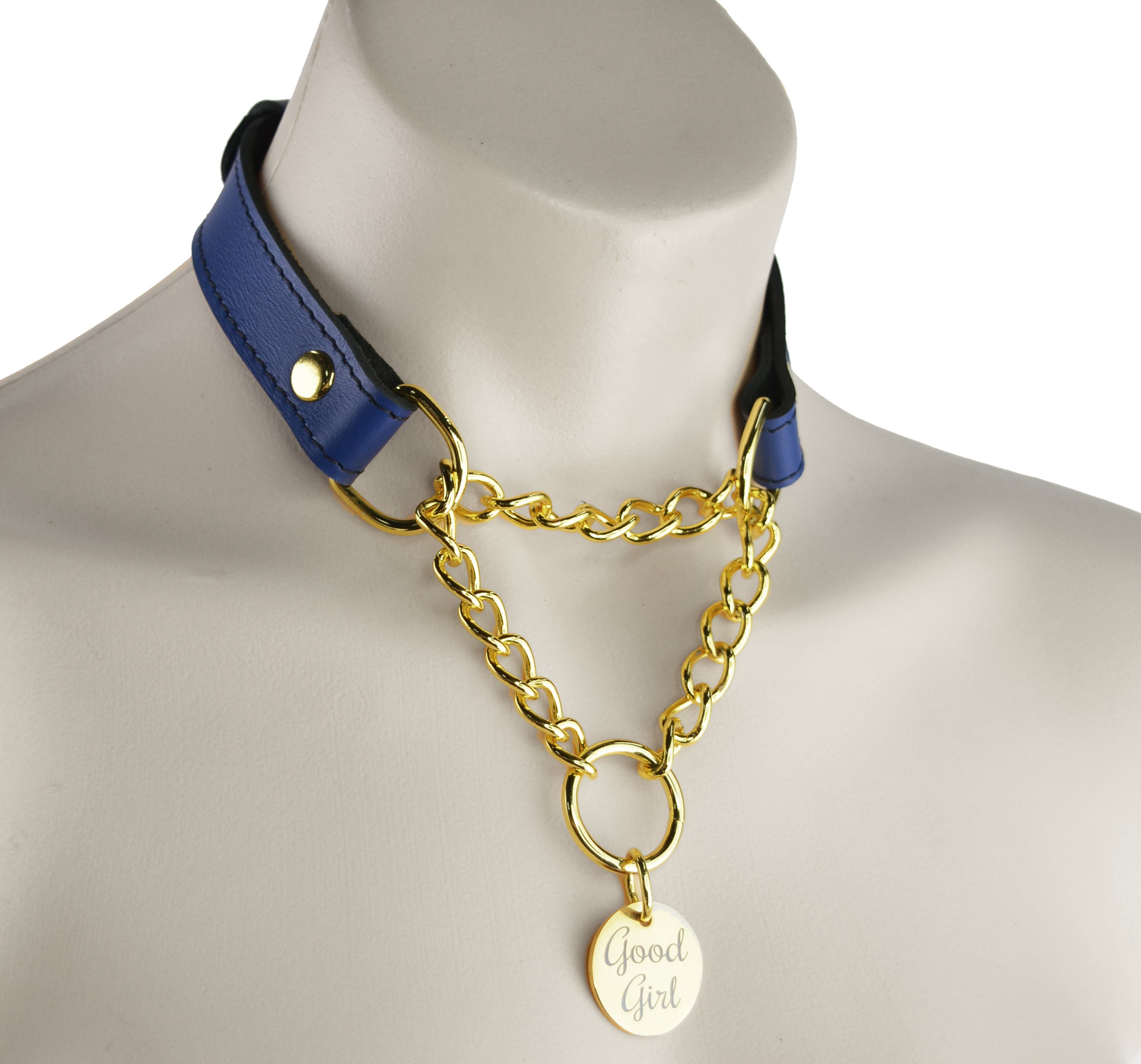 Turn heads with this unique martingale collar with custom engraved round gold tag! Handcrafted from stunning soft full grain deep blue leather, stitched with matching thread and also featuring a gold chain and O-Ring this collar is pure luxury.