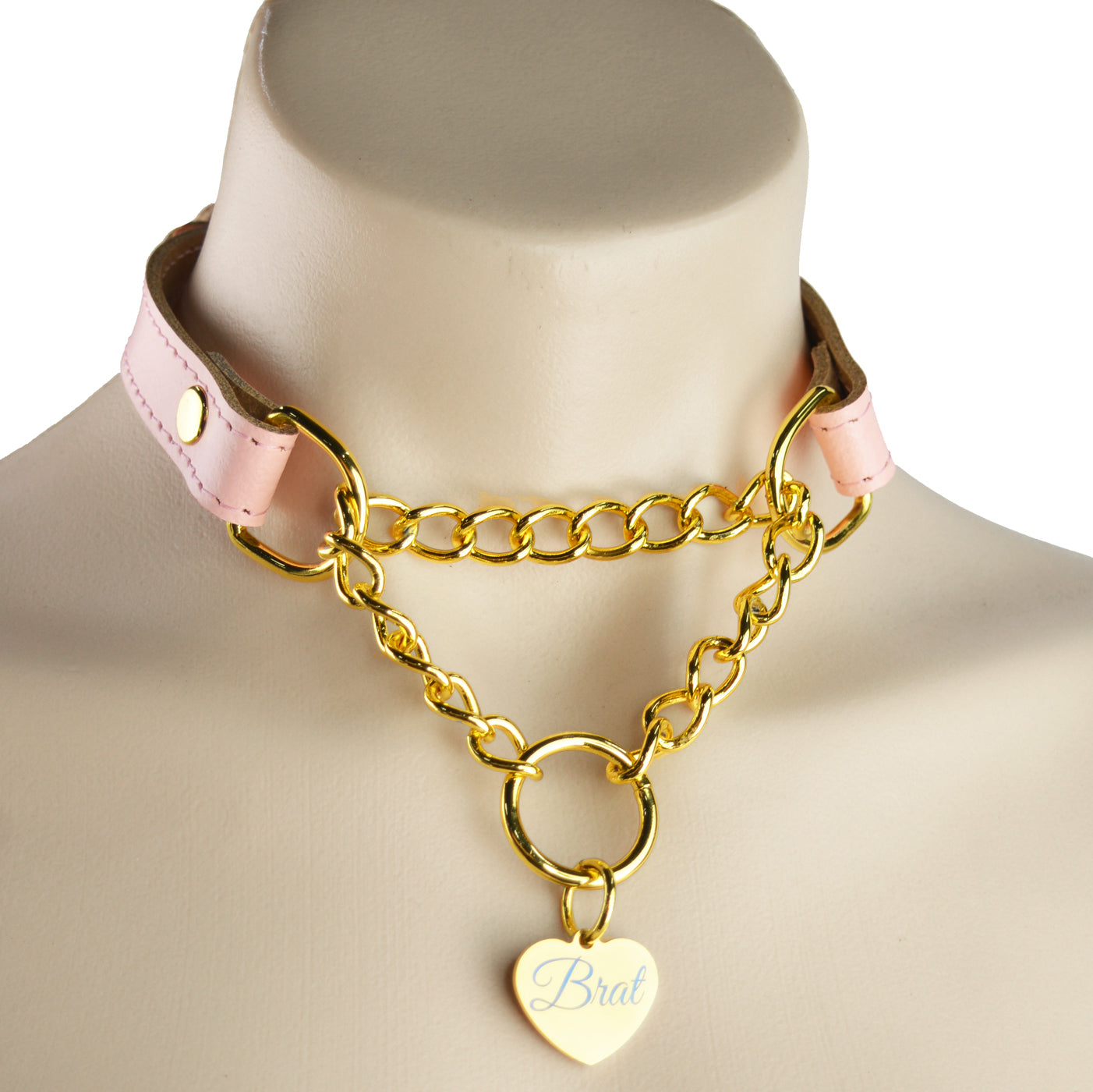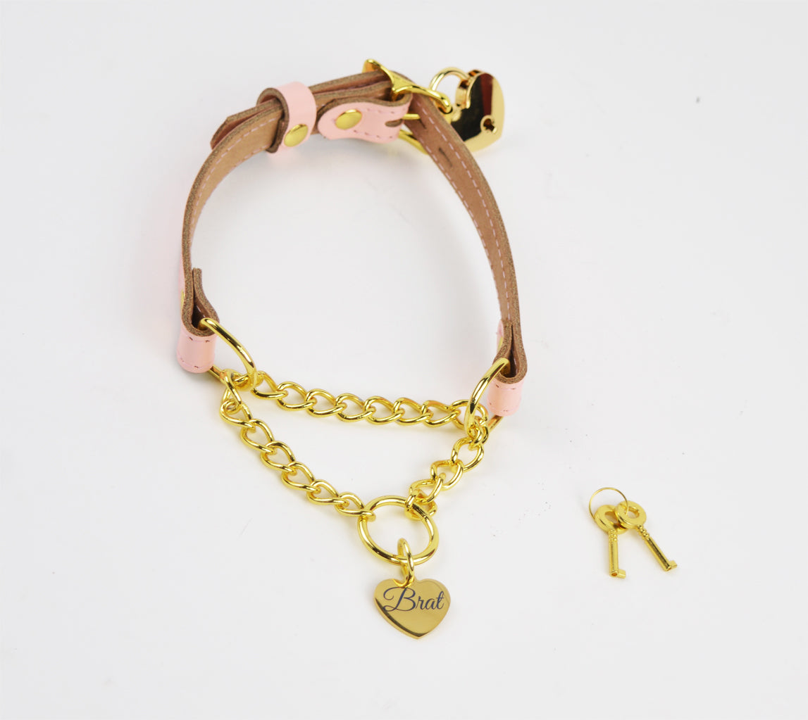 Turn heads with this unique martingale collar with custom engraved gold love heart tag! Handcrafted from stunning Blush Pink leather, stitched with matching thread and also featuring a gold chain and O-Ring this collar is pure luxury.