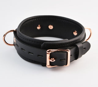 Premium Black Leather & Rose Gold Restraint Set - Wrist, Ankle & Thigh Cuffs, Collar, Cross Connector, Snap Hooks & Padlock