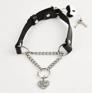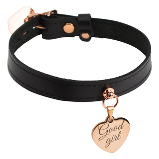 Black Leather Collar with Custom Engraved Rose Gold Love Heart Pendant – 'Good Girl'