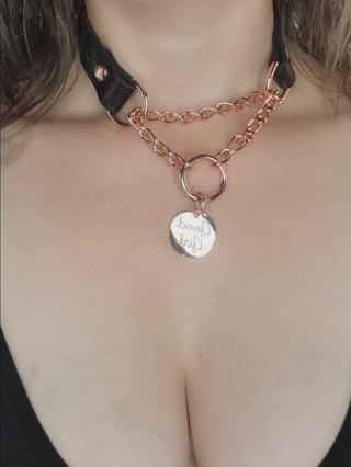 Black Custom Engraved Leather Martingale Day Collar - Rose Gold Round Pendant