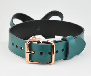 Emerald and Rose Gold Leather Collar With Bow and Custom Engraved Love Heart Pendant