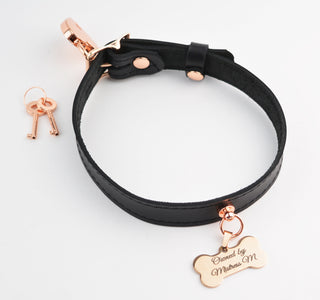 Premium BDSM Black Leather Bow Collar With Custom Engraved Rose Gold Pendant and Leash