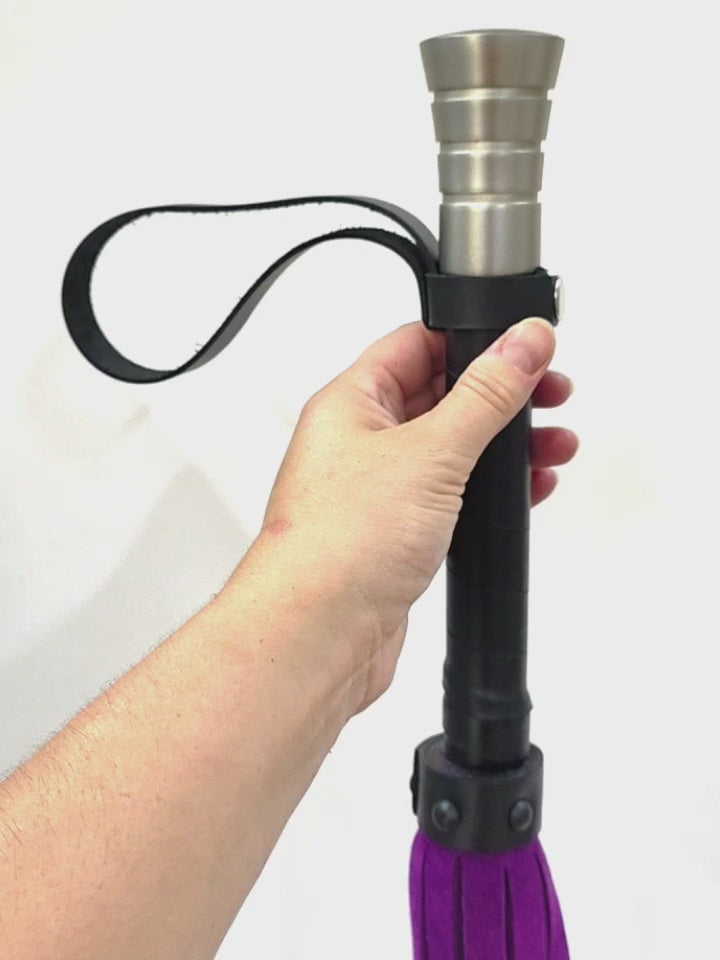 This premium flogger is hand crafted from beautiful supple suede leather and has 40 tails.A great heavy flogger with a beautiful handle making it perfectly balanced.The handle is hand wrapped in leather and appointed with a detachable hanging strap.Specifications:Total length including handle is 81cm (32”).Fall (length of tails) is 60cm (24”).