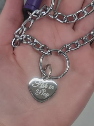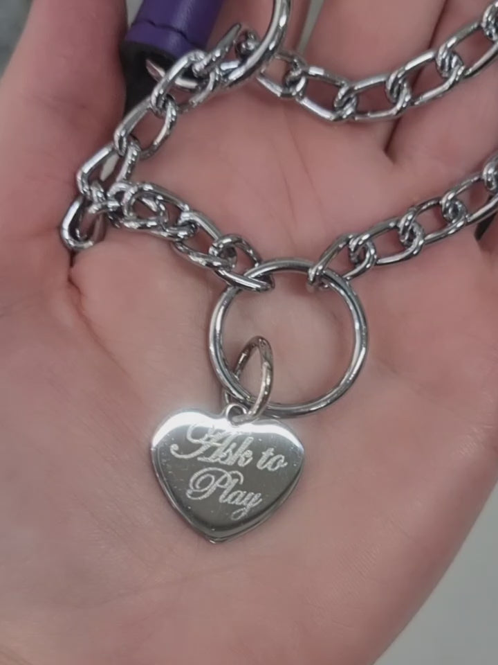 Turn heads with this unique martingale collar with custom engraved silver love heart tag! Handcrafted from gorgeous top grain purple leather, stitched with black thread and also featuring a steel chain and O-Ring this collar is pure luxury.