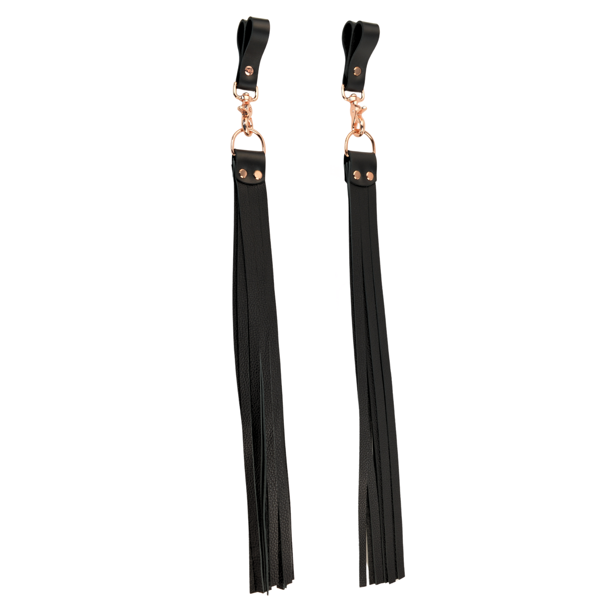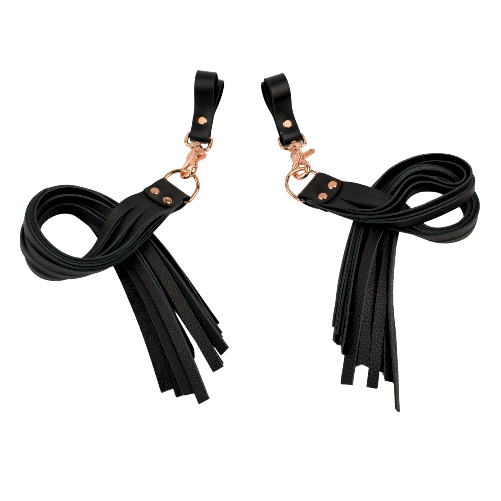 Handcrafted in Australia each flogger features 15 supple tails cut from premium black nappa leather, chosen for its softness, flexibility, and beautiful movement. With every flick of the wrist, the tails spread and land in a way that creates layered sensation across the skin. The rose gold hardware adds a striking contrast against the deep black leather, making each pair an elegant and eye catching display (also available in silver hardware).