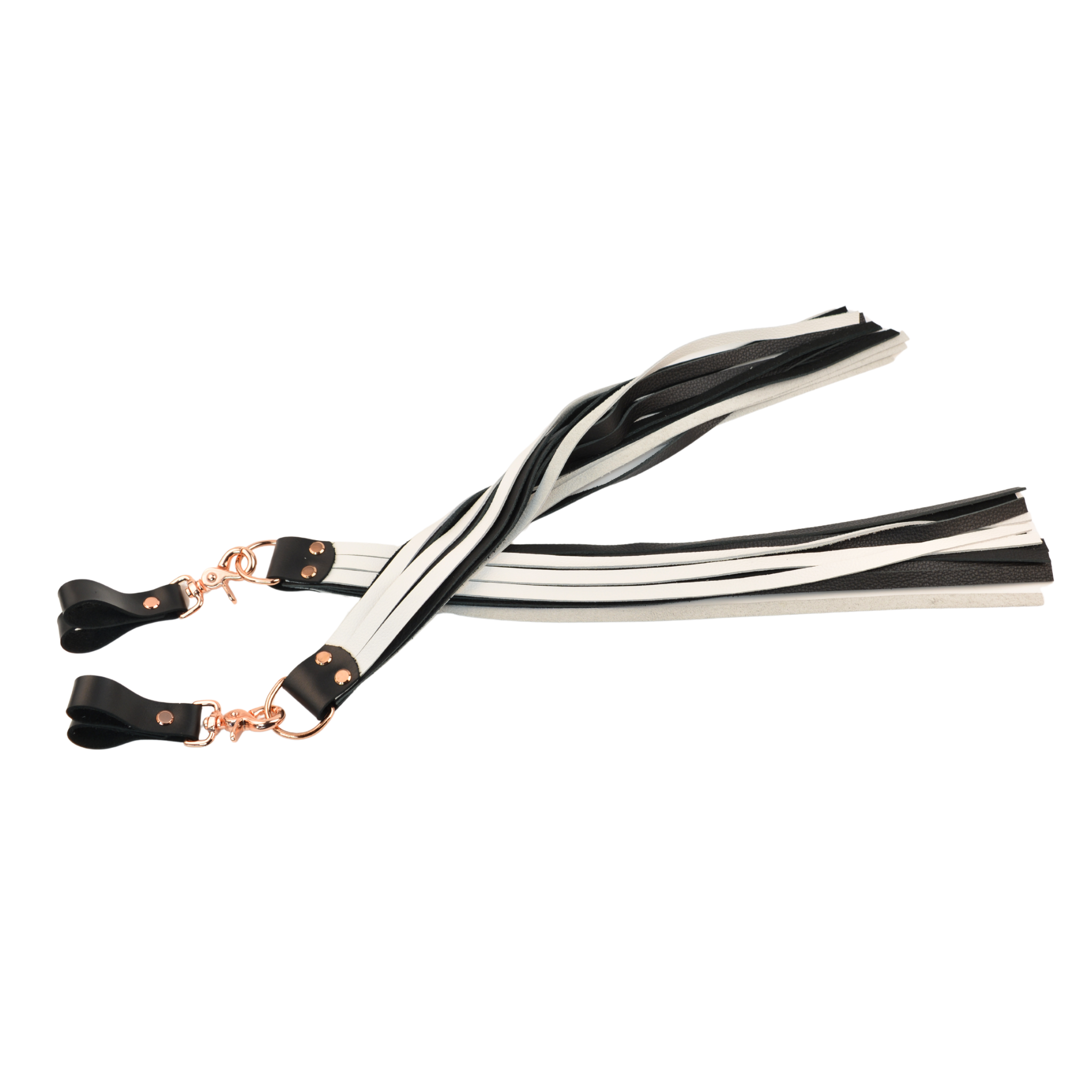 Handcrafted in Australia each flogger features 15 supple tails cut from premium black & white nappa leather, chosen for its softness, flexibility, and beautiful movement. With every flick of the wrist, the tails spread and land in a way that creates layered sensation across the skin. The rose gold hardware adds a striking contrast against the leather, making each pair an elegant and eye catching display (also available in silver hardware).