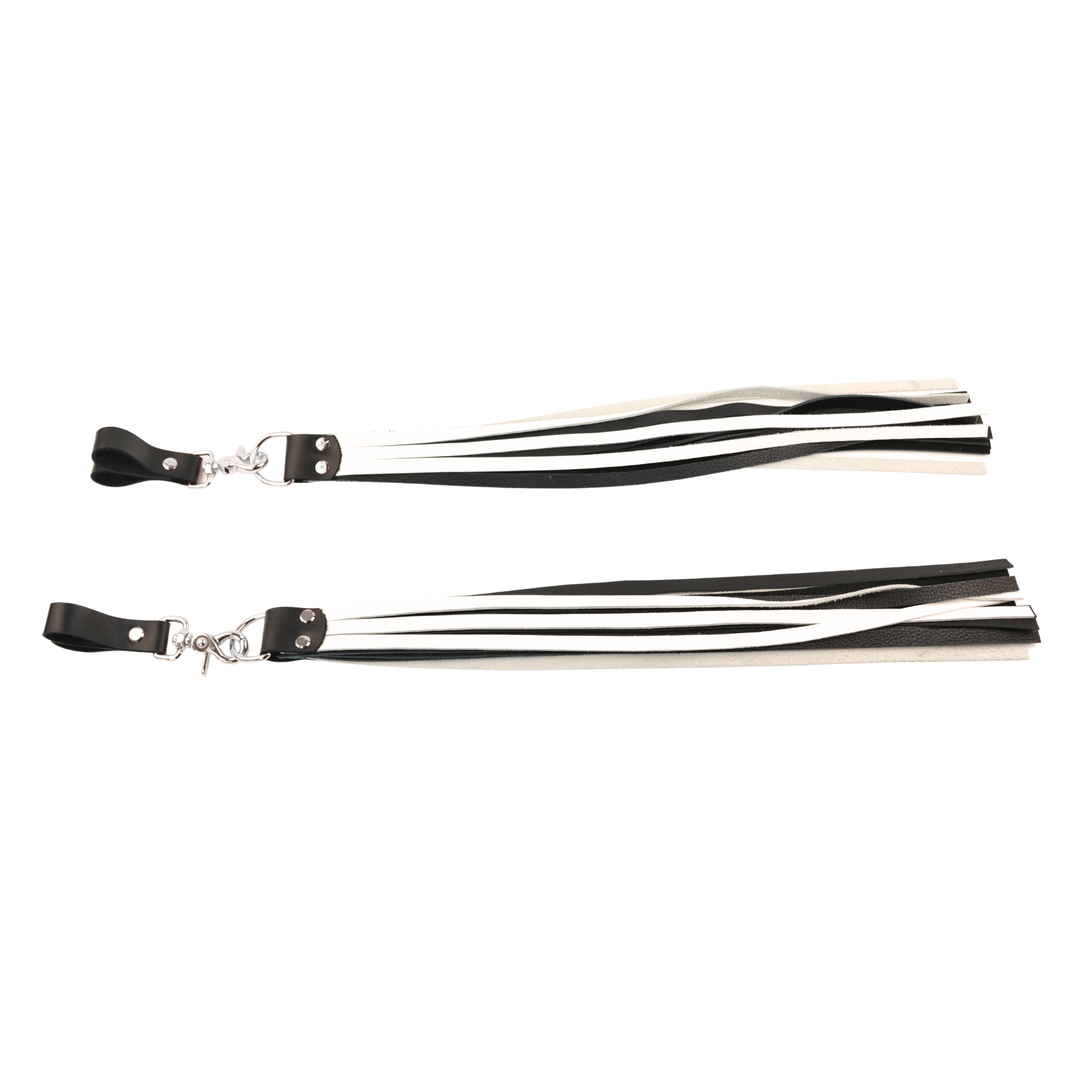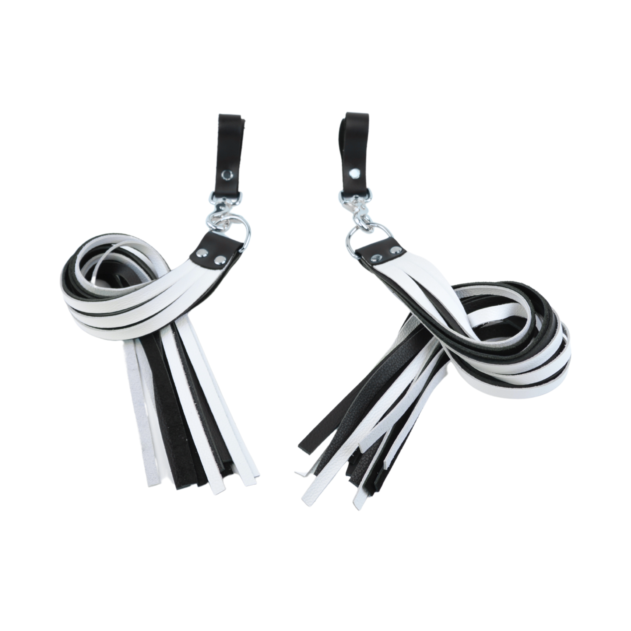 Handcrafted in Australia each flogger features 15 supple tails cut from premium black & white nappa leather, chosen for its softness, flexibility, and beautiful movement. With every flick of the wrist, the tails spread and land in a way that creates layered sensation across the skin. The silver hardware adds a striking contrast against the leather (also available in rose gold hardware).