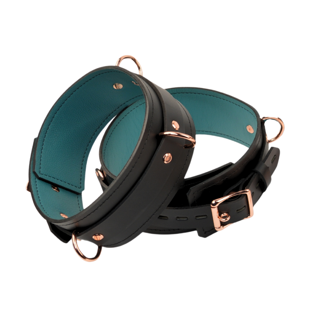 These Premium thigh cuffs are made from heavy duty leather, & lined with beautiful soft nappa leather. Now available in this beautiful black and teal green combination appointed with stunning rose gold hardware (or your choice of silver, gold or black hardware).Appointed with solid D-rings and with the option of lockable buckles, this is very secure set of restraints your sub won’t escape from.