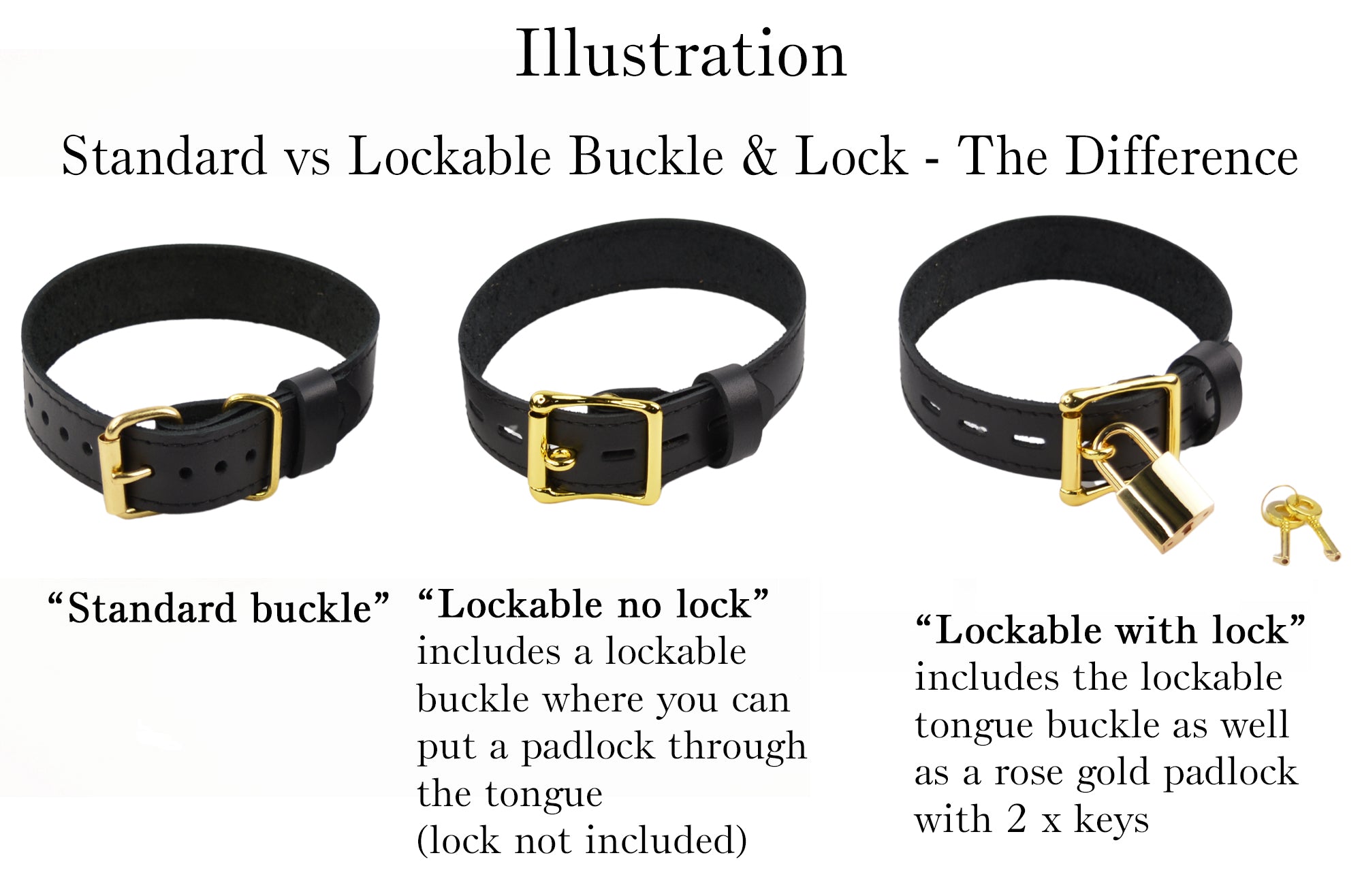 Please note if you opt for the locking buckle, the buckle itself will be black, whereas the rest of the hardware will remain gold.