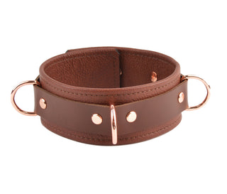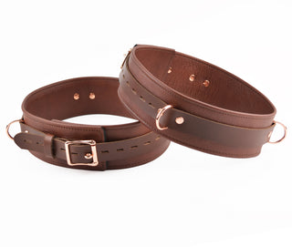Brown Leather & Rose Gold Restraint Set - Wrist & Ankle Cuffs, Collar, Cross Connector, Snap Hooks & Rose Gold Padlocks