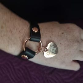 This stunning Secret Series custom engraved wrist cuff is a must have addition to compliment any outfit! Handcrafted from high quality soft leather and appointed with a stunning rose gold O-Ring (two size options available) and love heart pendant this cuff is sure to turn heads.