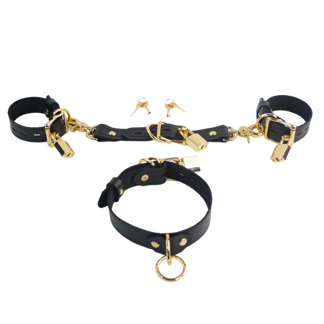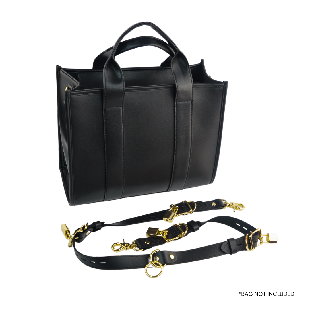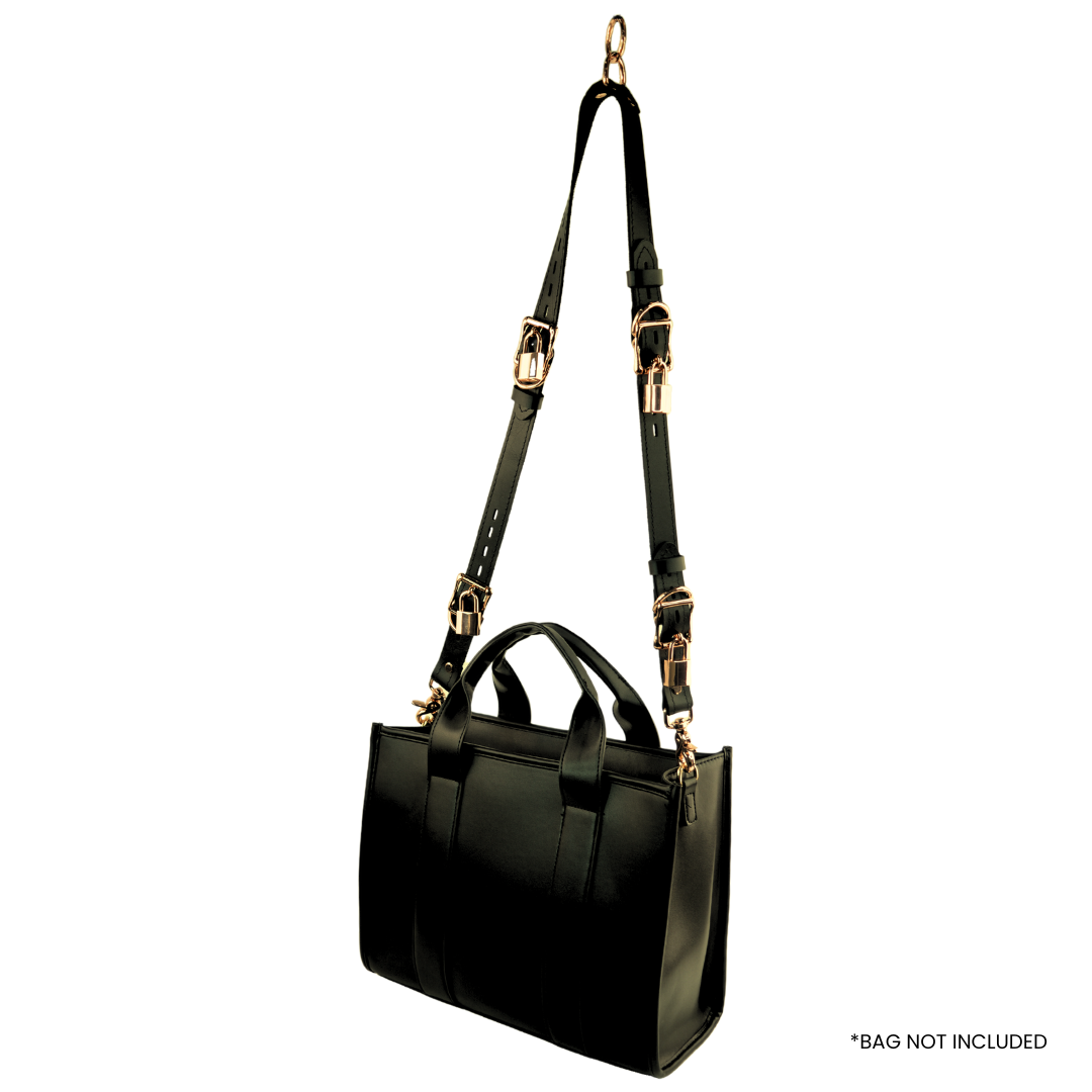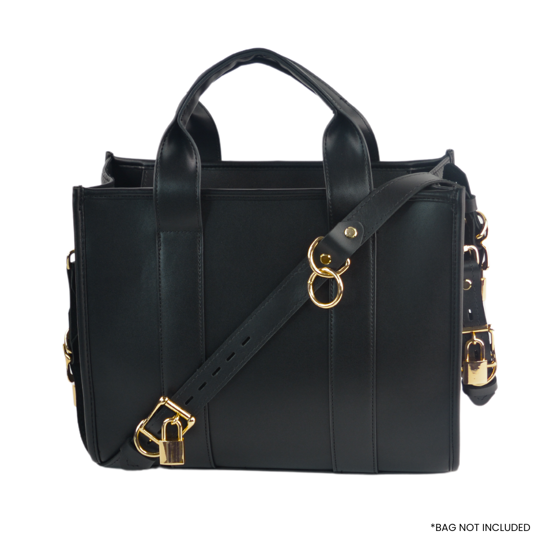Each piece of the V3rse Strap is made from luxurious full grain black New Zealand leather, smooth and supple to touch but incredibly strong, and all artfully stitched with black thread. Every lockable buckle, D-ring and snap hook is made from heavy duty steel plated with a beautiful gold finish. The hardware is secured with matching gold Chicago screws set with Loctite so you know there will never be any risk of breakage! For the finishing touch each buckle features a stunning gold square padlock. A high-end fashion feature on the bag strap with the added benefit of making sure no one escapes when converted into play mode!