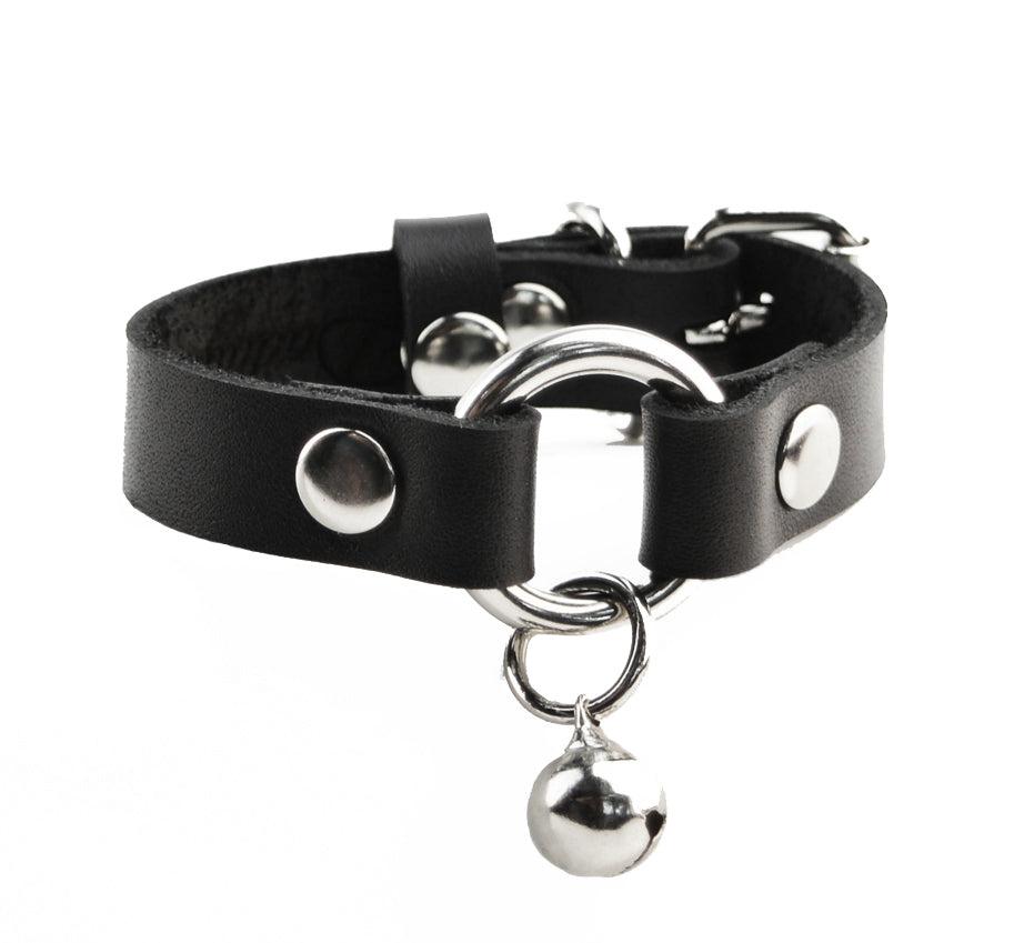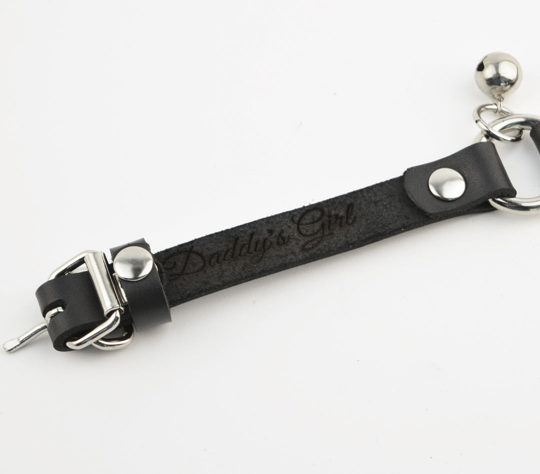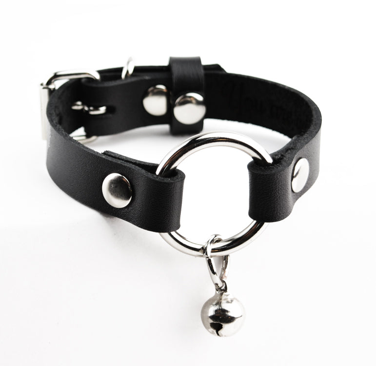 This stunning Secret Series custom engraved wrist cuff is a must have addition to compliment any outfit! Handcrafted from high quality soft leather and appointed with a stunning silver (steel) O-Ring (two size options available) and a cute kitten bell this cuff is sure to turn heads.