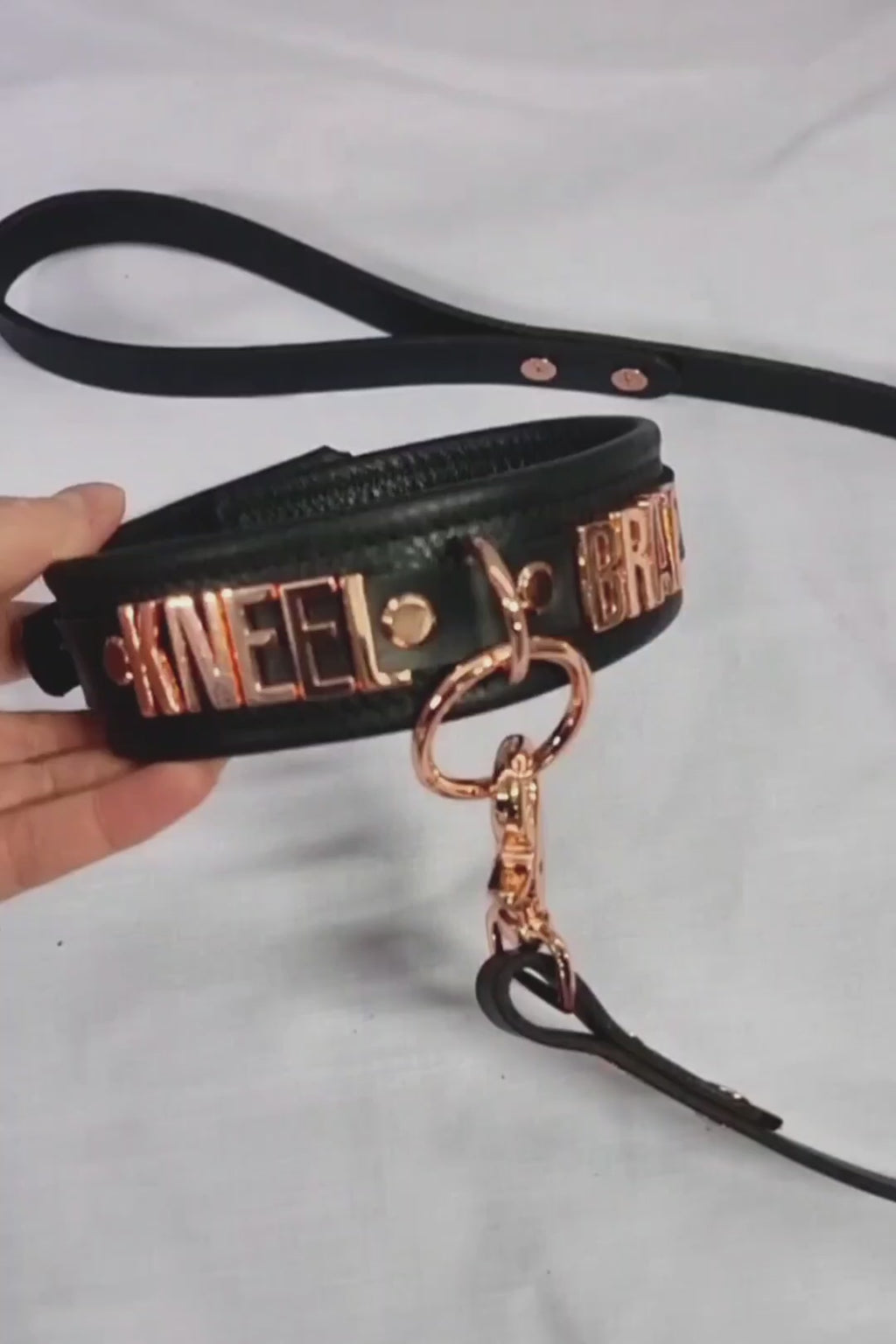 Want to show off your collared sub with a unique message? This is the collar for you! Handcrafted from a gorgeous soft black nappa leather with a black leather strap and featuring rose gold lettering of your choice this collar will make your sub beg to have it wrapped around their neck. The collar also comes with two featured attachment points - a sturdy rose gold D and O-Ring at the front, and a D-ring at the back. To make the most of these the collar also comes with a matching 75cm / 30" leash.